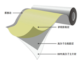 非沥青基高分子预铺防水卷材,由高密度聚乙烯合成的高分子片材(HDPE)、高分子自粘胶、表面覆颗粒及涂层防粘层,而制的一种高强度自粘反应型防水卷材,能与混凝土结构自防水实现融合,是目前应用最广泛的环保防水材料。