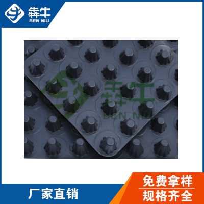 蓄排水板采用通用工程塑料hdpe注塑工艺,断裂老化,抗压(盖土后更稳定),施工时不用踩压扁。
