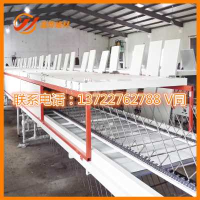 彩石金属瓦设备包括彩石瓦传送带、依次设置在彩石瓦传送带上的是:喷胶机构、撒布机构、翻转机构、第2喷胶机构,所述一喷胶机构采用具有俯仰角度的链条传动路线,有利于均匀喷胶;