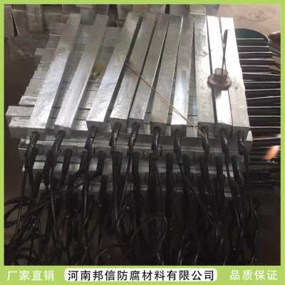 镁阳极施工时,可以将填包料倒进预先钻好的孔洞里,也可以将阳极预先装进用可透水的布料做成的内有填包料的袋子里,再将装有阳极的袋子放进钻孔里,浇水并回填细土。因为阳极与焦炭之间的电位差,能够形成强侵蚀电池,导致阳极迅速破坏。阳极棒的粗细差别很大,可以做成细丝状,也可以是直径70mm的棒,单根阳极较长1.5mm,阳极质量取决于合金。锌阳极与铝阳极不合用于淡水,由于它们的驱动电压太低,且较易钝化,固然含铝阳极有足够负的静电位和低较化性,但因含而不能用于饮用水。钢芯一般由镀锌的、磷化的或普通的钢条、钢棒或钢管制成,在浇铸阳极时埋置在里面。但是它的电流效率低,是一大缺点。