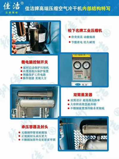 1、压缩空气冷干机中制冷压缩机采用高温型全封闭制冷压缩机,运转稳定,噪声低,性能可靠,省电寿命长。