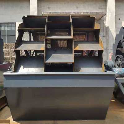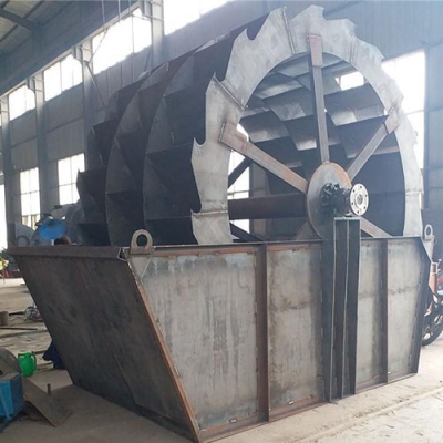 轮式洗砂机工作时,电机通过三角带、减速机、齿轮减速后带动叶轮缓慢转动,砂石有给料槽进入洗槽中,在叶轮的带动下翻滚,并互相研磨,除去覆盖砂石表面的杂质,同时破坏包覆砂粒的水汽层,以利于脱水;同时加水,形成强大水流,及时将杂质及比重小的异物带走,并从溢出口洗槽排出,完成清洗作用。干净的砂石由叶片带走,最后砂石从旋转的叶轮倒入出料槽,完成砂石的清洗作用。