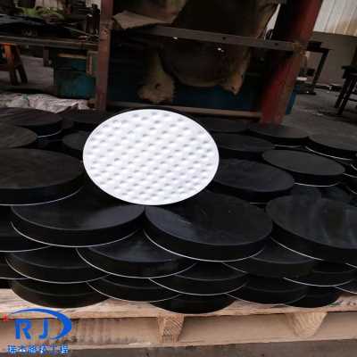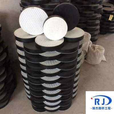 在上述的圆形板式橡胶支座表面粘复一层1.5mm-3mm的聚四氟乙烯圆形板式橡胶支座,制造成聚四氟乙烯滑板式橡胶支座。它除了竖向钢度与弹性变形,能承受垂直荷载及适应梁端转动外,因聚四氟乙烯板的低磨擦系数,可使梁端在四氟板表面向内滑动,水平位移不受限制;特别适宜中、小荷载,大位移量的桥梁使用。